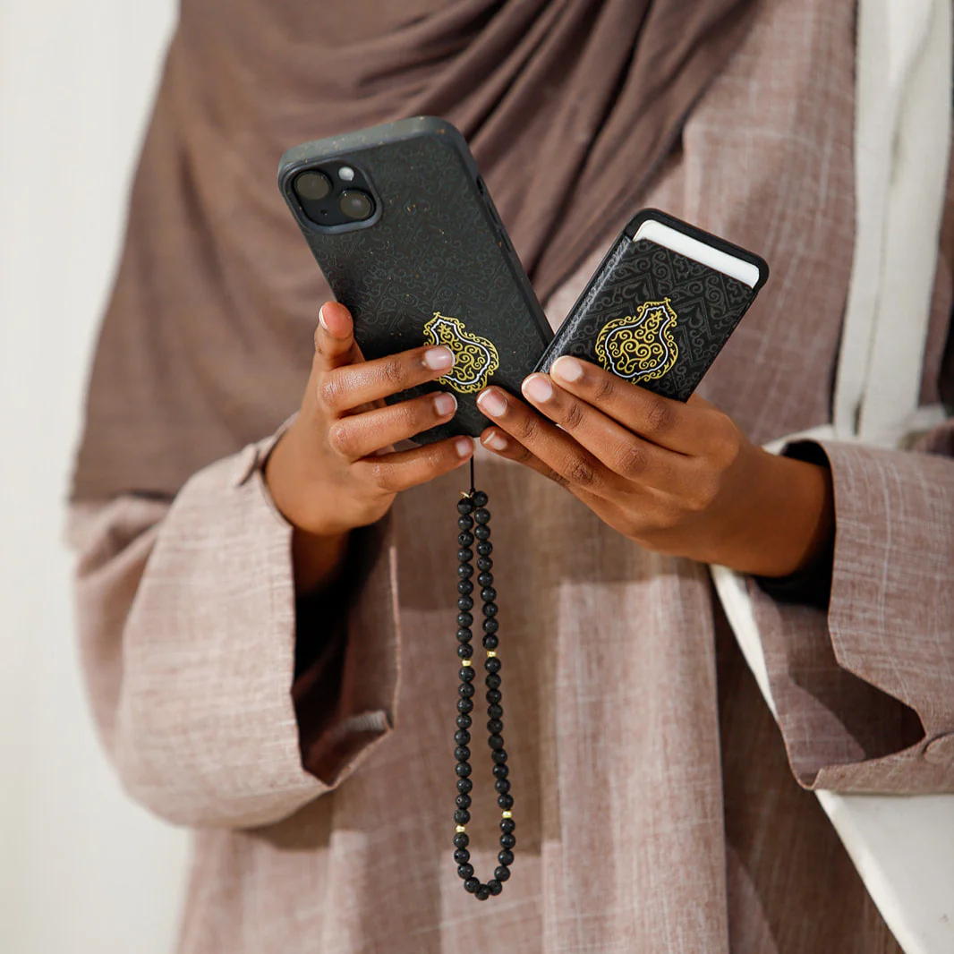 The perfect accessory for your phone case! Made from natural materials with calming properties, this unique charm doubles as a tasbeeh for those moments of reflection wherever you go. The natural lava stone is designed to remind you of the Black Stone located in at the Epicentre of the universe - the Kaaba